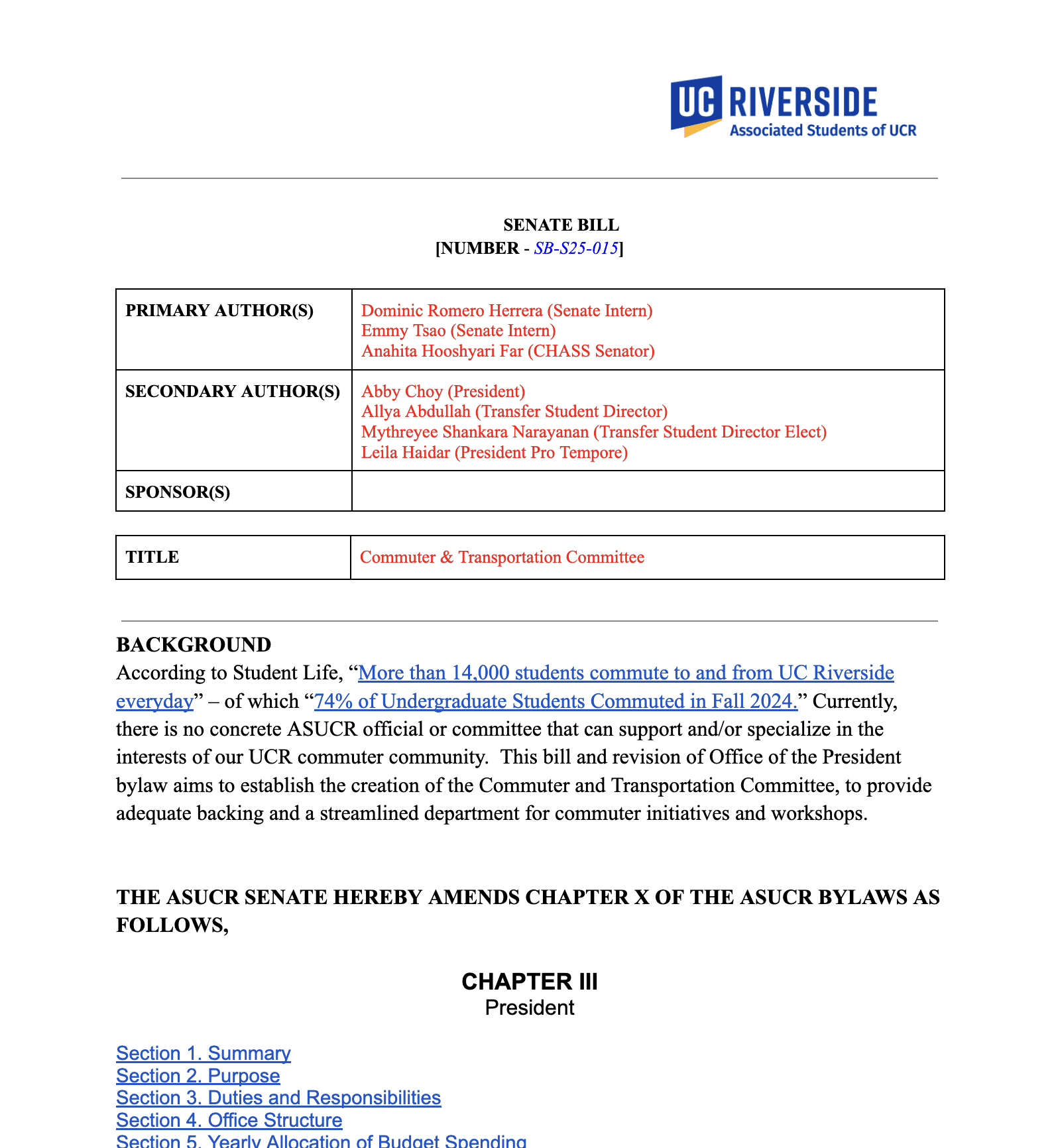 With all input, I proposed the creation of a committee — SB-S25-015 — Otherwise known as the “Commuter and Transportation Committee." It aims to provide commuters a platform that can specialized in their needs, while also serving as a basis for collaborative efforts between other offices in ASUCR to address commuter-related concerns.